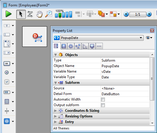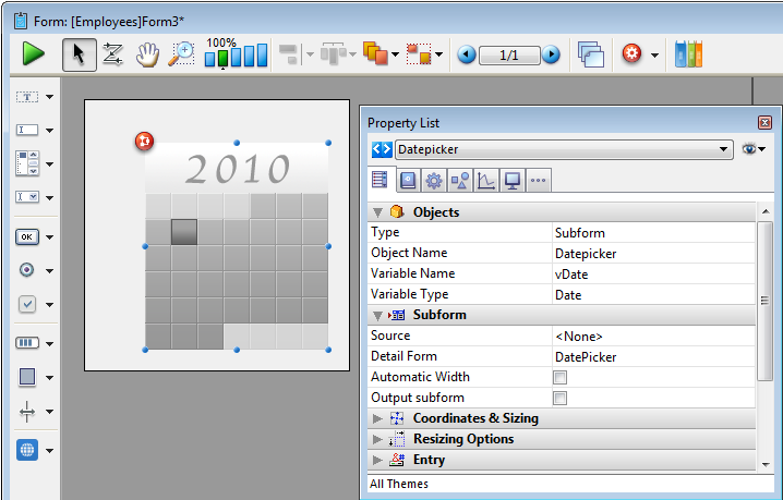 Note: Initially, the Date picker, Pop-up date and Date entry area objects all share the same Date variable and will display matching dates when used on the same form.