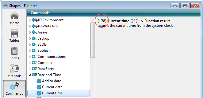 You can use 4D commands or functions directly as expressions. In this case, it is a good idea to insert the command number escape code in the 4DExpression parameter. This way the expression will be correctly evaluated no matter which 4D language version is used, or if the command name changes in a future 4D release. The syntax to use is "<command_name>:C<command_number>. For example, to call Current time, write "Current time:C178".