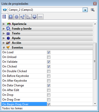 Para que la aplicación procese estos eventos, deben haber sido seleccionados de una forma adecuada en la Lista de Propiedades: