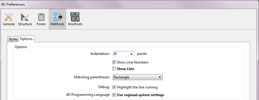 Esta configuración se puede desactivar utilizando la nueva opción Uso de la configuración del sistema regional en la página Métodos/Opciones del diálogo Preferencias de 4D: