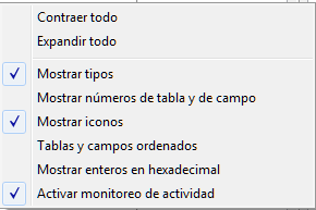 En las versiones anteriores de 4D, esta información se puede encontrar en la lista Variables/Proceso, donde se hace referencia a las variables dinámicas a través de su nombre interno (por ejemplo, $form.9.8). Las variables dinámicas ya no se muestran en esta lista; sólo se pueden leer a través de la lista Valores del formulario actual. Aún puede mostrar el nombre interno de las variables dinámicas seleccionando el comando Mostrar tipos en el menú contextual: