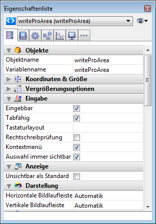 Ein 4D Write Pro Formularbereich wird über standardmäßige Eigenschaften der Eigenschaftenliste konfiguriert, wie Objektname und Variablenname, Koordinaten, Eingabe, Anzeige, Darstellung, bzw. Ereignisse.
