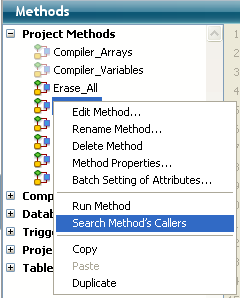 エクスローラーから、特定のプロジェクトメソッドを参照するオブジェクトのリスト (他のメソッドやメニュー) を検索することができます。この機能はコンテキストメニューあるいはオプションメニューのメソッドの呼び出し元を検索コマンドで利用できます: