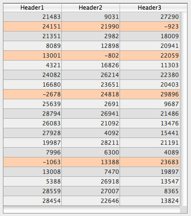 Dado un list box cuyas filas tienen un color alterno gris/gris claro, definido en las propiedades del list box. Un array de color de fondo también se ha definido para el list box con el fin de cambiar el color de las filas en las que al menos un valor es negativo por naranja: