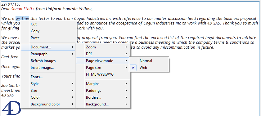 Se a propriedade Menu contextual está selecionada por uma área 4D Write Pro (ver Criar uma área 4D Write Pro), um menu contextual completo estará disponível para os usuários no modo Aplicação: