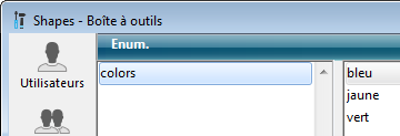 Vous voulez afficher une combo box basée sur une énumération nommée "colors" définie dans la Boîte à outils (contenant les valeurs "bleu", "jaune" et "vert") et afficher "vert" par défaut :