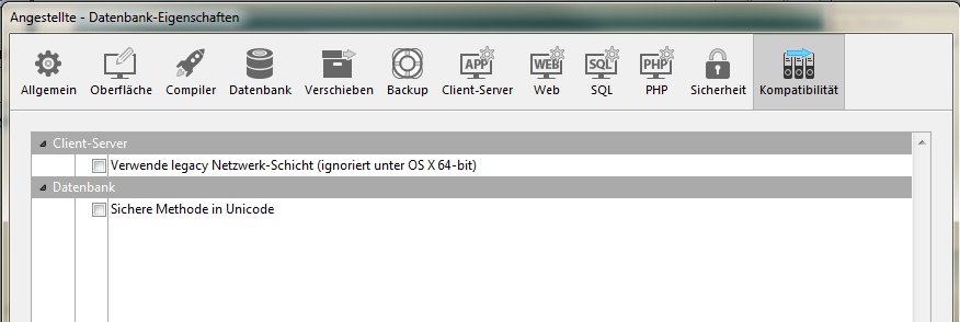 Das Dialogfenster Kompatibilität enthält in 4D v15 zwei neue Optionen.