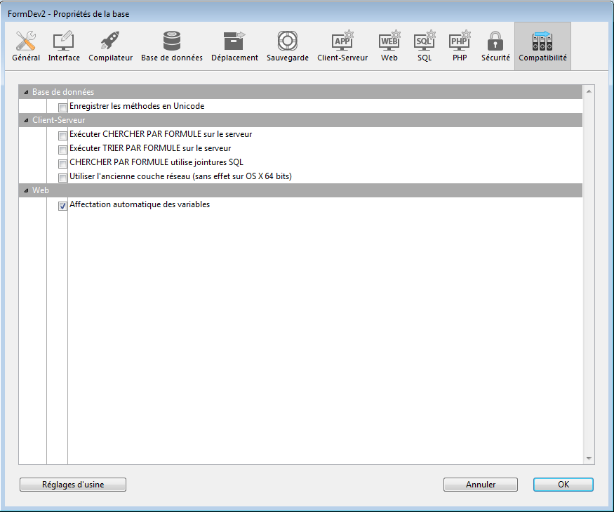 Pour plus d'informations sur ces options, cf. Page Compatibilité.