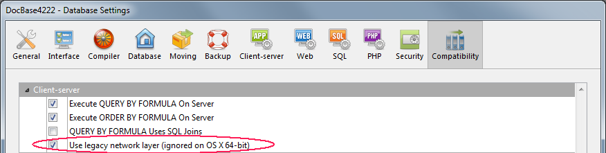 Uma nova opção de compatibilidade lhe permite ativar ou desativar a capa rede legacy em seu 4D Server em qualquer momento. Pode utilizar: