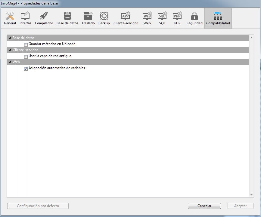 - deseleccionada para las nuevas bases creadas con 4D v14 R5 y superiores. Estas bases utilizan la nueva capa ServerNet. Marque esta opción para volver a la capa de red antigua.