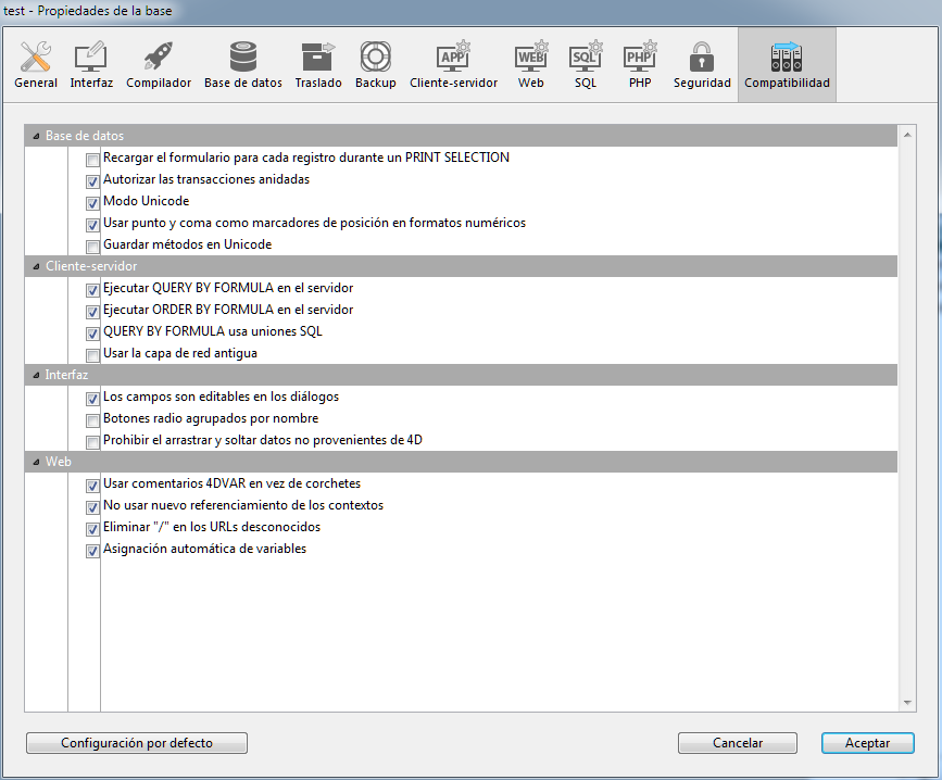 Dos nuevas opciones están disponibles en el diálogo Compatibilidad en 4D v15.