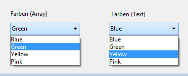 ieses Beispiel zeigt die unterschiedliche Arbeitsweise des Befehls für ein PopUp-Menü, das einem Array Text oder einer Textvariablen zugewiesen ist. Hier die beiden PopUp-Menüs im Formular
