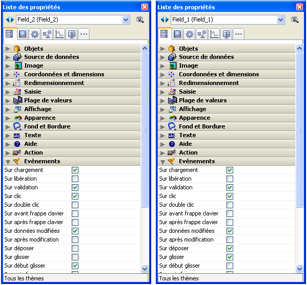 Pour que l'application puisse traiter ces événements, il doivent avoir été sélectionnés de manière appropriée dans la Liste des propriétés :