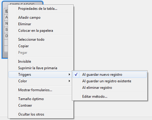 Puede acceder directamente al trigger de una tabla desde la ventana de estructura haciendo clic en el botón Editar... del Inspector o seleccionando Editar método... en el submenú contextual. Para mayor información sobre triggers, consulte la sección Tipos de métodos.
