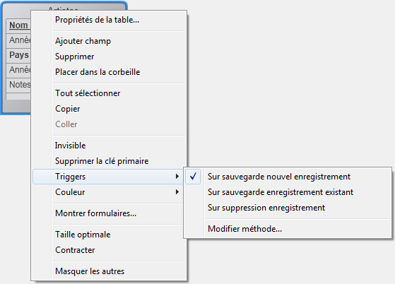 Les événements triggers peuvent être paramétrés dans la Palette Inspecteur ou via le menu contextuel associé à la table (clic droit sur la zone de libellé de la table) :