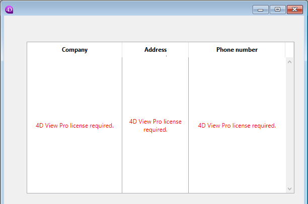 Sin embargo, 4D View Pro requiere la misma licencia que 4D View. Es necesario tener esta licencia instalada en su aplicación con el fin de activar estas funcionalidades. Cuando no se ha instalado la licencia 4D View, el contenido de un list box que utiliza una funcionalidad 4D View Pro no se muestra en ejecución y se muestra un mensaje de error: