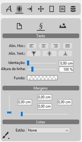 Além disso os ajustes gerais que são aplicados a todo o documento, a alinhação do texto e as margens podem ser ajustadas de forma independente para cada parágrafo ou imagem no texto. Use os ícones na parte superior do painel para configurar estes ajustes por separado para a área desejada ( para o documento,