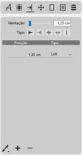 Este painel gerencia as tabulações dos parágrafos na área 4D Write Pro. Todo valor Indentação definido, seja através do deslizados ou introduzindo um valor diretamente na área, é usado de forma pré-determinada como a distância de deslocamento entre as abas posteriores adicionadas. Quando for escolhido um Tipo usando um dos botões, é aplicado este tipo a todas as atabulações existentes para o parágrafo.