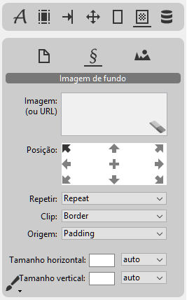 Este painel gerencia as imagens de fundo para a área 4D write Pro. Pode arrastar e soltar imagens ou URLs diretamente na área Imagem. Além disso, um clique direito na área Imagem mostra uma lista drop down onde vários padrões de fundo estão disponíveis como padrão. É possível ajustar a posição e o tamanho de cada imagem ou padrão usado e definir os ajustes personalisados. Pode usar o ícone para eliminar uma imagem ou padrão existente.