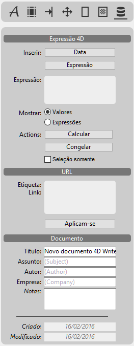 Este painel insere e administra as expressões 4D e as URLs na área 4D Write Pro e inclui uma área para a introdução de informação útil sobre o documento.
