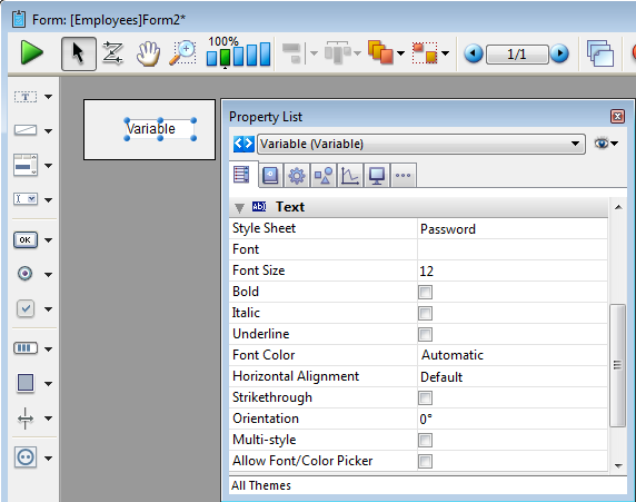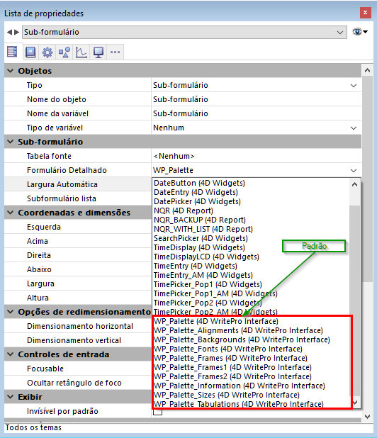 De forma pré-determinada, o subformulário Widget 4D Write Pro oferece um conjunto completo de painéis de controle. O painel de controle pré-determinado é o formulário detalhado "WP_Palette". Entretanto, também pode usar estes painéis de controle individualmente, selecionando o formulário detalhado correspondente na Lista de Propriedades do editor de formulários: