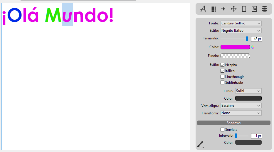 O menu Alin. vert. permite mudar o texto a superíndice o subíndice e o menu Transformar permite escolher entre as diferentes combinações de tipo de fonte: