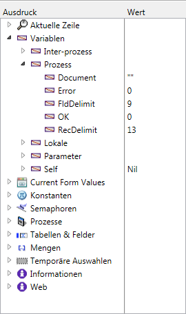 Prozess: Zeigt die Liste der im aktuellen Prozess verwendeten Prozessvariablen. Diese Liste ist selten leer. Die Werte der Prozessvariablen können Sie ändern.