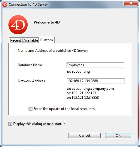 Note: This parameter is not taken into account in custom client-server applications. In theory, the client application connects directly to the server application, without passing by the connection dialog box. However, in the event of an error, this dialog box will appear; in this case, the publication name of the server application is the name of the compiled database.
