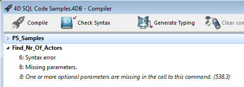 関係するメソッドを直接4D のメソッドエディター上で開くには、検出された各エラーをダブルクリックします。エラーを含む行が反転表示され、エラーのタイプがウインドウのシンタックスエリアに表示されます。エディターのメソッドメニューから前のエラー / 次のエラーコマンドを選択すると、エラーが含まれる各行を移動することができます。