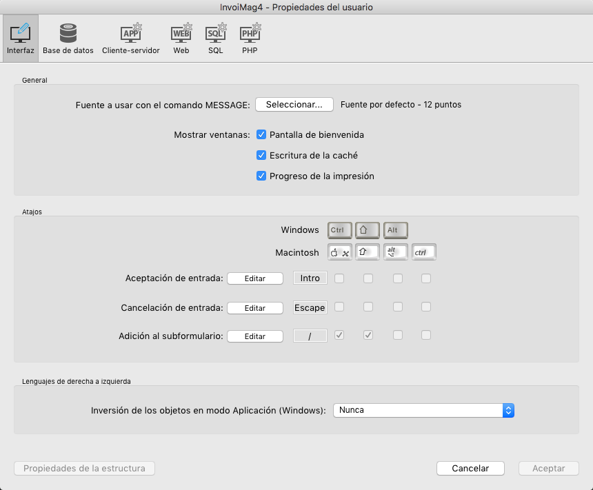 3 (el más bajo) | Configuración de la estructura (o Propiedades de la base cuando la funcionalidad "Configuración de usuario" no está habilitada) | en el archivo de estructura (.4db) | Ubicación única cuando a configuración de usuario no está activada. Se aplica a todas las copias de la aplicación. |