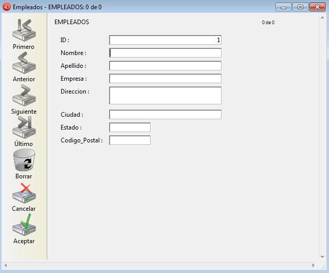 Aparece otro registro vacío, y el usuario hace clic en el botón Cancelar (el que tiene una “X”) para terminar el “bucle de entrada de datos.” El usuario vuelve a la barra de menús.