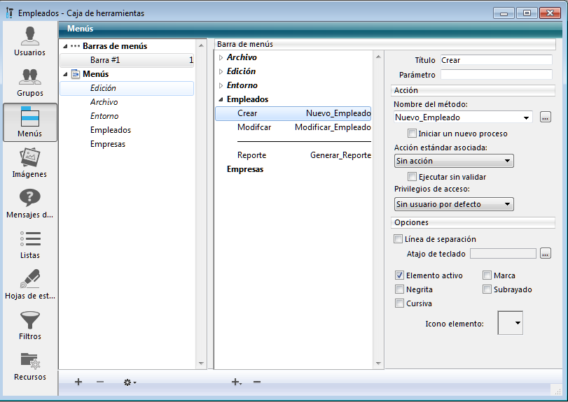 La barra de menús fue creada en el entorno Diseño, utilizando el editor de menús.