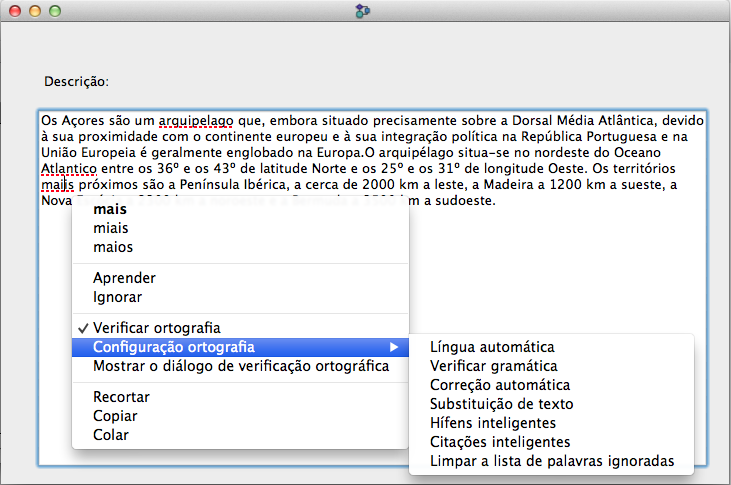 Em verde os erros gramaticais (corretor nativo OS X unicamente),