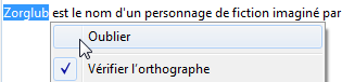 Oublier (menu contextuel) : cette option apparaît lorsqu’un mot précédemment appris est sélectionné. Elle permet de le supprimer de la liste des mots appris et donc, de le signaler à nouveau comme faute d’orthographe potentielle.