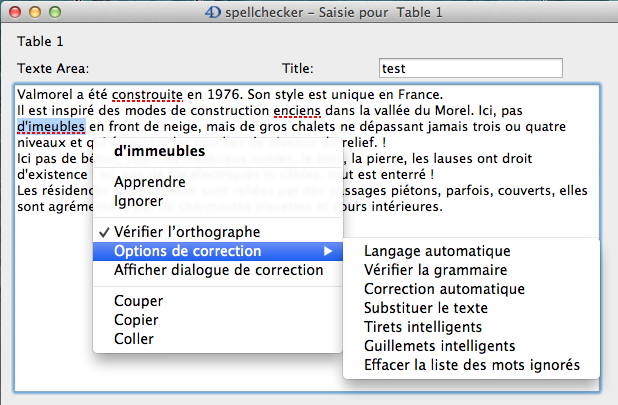 sous OS X uniquement, le correcteur orthographique natif. Par défaut sous OS X, 4D utilise le correcteur natif. Vous pouvez choisir d’utiliser le correcteur Hunspell à l’aide de la commande SET DATABASE PARAMETER). A noter que des fonctions supplémentaires sont proposées par le correcteur natif OS X (cf. ci-dessus).