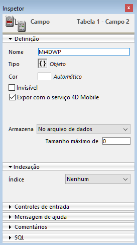 A seguir, a área 4D Write Pro é associada ao campo de tipo Objeto.