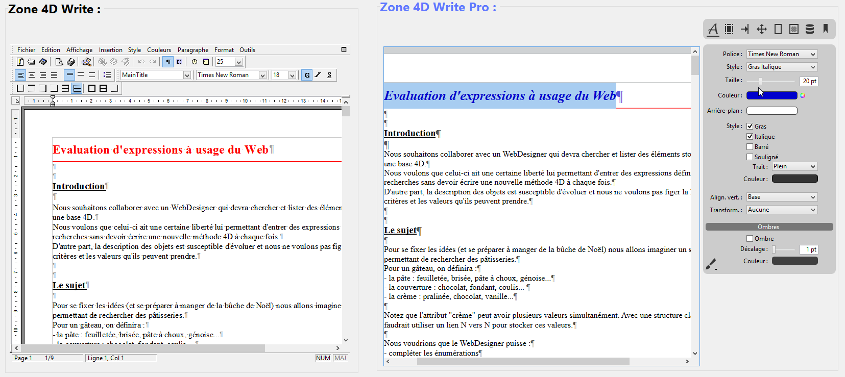 上図では、左に 4D Write エリア、右に 4D Write Pro エリアを表示しています (新しいライブラリオブジェクトを使って作成 - 後述参照)。4D Write エリアの中身は WP New コマンドを使って簡単に変換することができます: