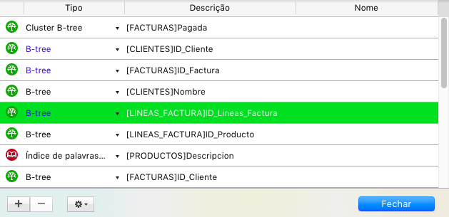 • Tipo: tipo de índice. Cada tipo de índice (Árvore-B, Árvore-B agrupada, palavras chaves) é representado com um ícone diferente.tipo de índice. É possível modificar o tipo de índice clicando no triângulo invertido e selecionando um valor diferente no menu pop-up.