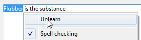 スペルチェックのオプションを表示するためには、下線の引かれた単語を右クリックします。コンテキストメニューが表示され、その中にスペルチェッカーのコマンドがあります: