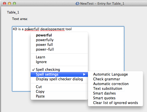 4Dでは、スペルチェックは絶えずテキストエリア内で実行されていて、エラーは破線の下線が直接テキストに引かれてハイライトされます: