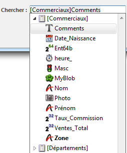 Vous pouvez également cliquer dans la zone d’édition et saisir la ou les première(s) lettre(s) de la table du champ (ne saisissez pas le caractère "[" ) : un mécanisme d’auto-complétion affiche des propositions correspondant à votre saisie :