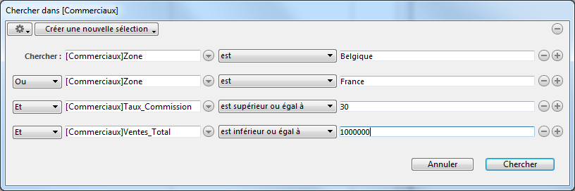 Vous pouvez combiner de nombreux opérateurs de conjonction pour créer des recherches telles que “Trouver les commerciaux à Paris ou en Belgique et dont le taux de commission est supérieur à 30 pourcents et dont les ventes sont inférieures à 1 000 000 Euros”. Voici cette recherche telle qu’elle peut être écrite dans l’éditeur de recherches :