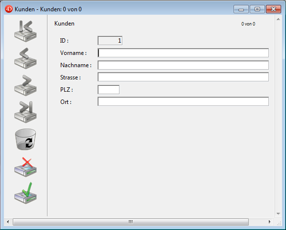 Auf dem Bildschirm erscheint ein leerer Datensatz. Der Benutzer klickt auf die Schaltfläche Abbrechen. Das ist die zweite Schaltfläche, gekennzeichnet mit “X”. Damit beendet er die Dateneingabe und kehrt zur Menüleiste zurück.