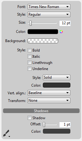This panel manages standard font styles and properties for the text of the 4D Write Pro area.
