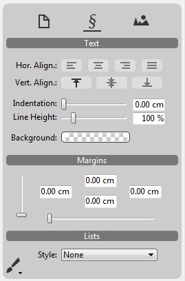 In addition to general settings applied to the entire document, text alignment and margins can be set independently for each paragraph and/or for each picture in the text. Use the icons at the top of the panel to configure these settings separately for the desired area ( for the document as a whole,