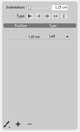Clicking on the button adds a new default tab stop to the paragraph. You can delete a tab stop by selecting it in the list and clicking the