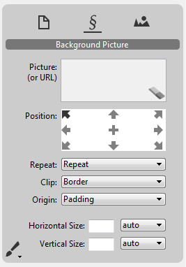 This panel manages background pictures for the 4D Write Pro area. You can drag and drop pictures or URLs directly onto the Picture area. In addition, a right-click in the Picture area displays a drop-down list where several background patterns are available by default. You can set the position and size of each picture or pattern used and define custom settings. You can use the icon to remove an existing picture or pattern.