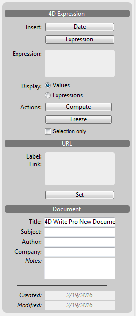 This panel inserts and manages 4D expressions and URLs in the 4D Write Pro area and includes an area for entering useful information about the document.