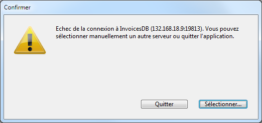 • Affichage d'un message d'erreur avec accès possible à la boîte de dialogue de sélection de serveur.