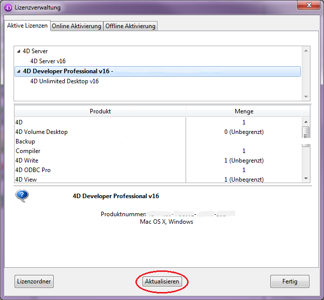 Wählen Sie im laufenden Betrieb von 4D oder 4D Server im Menü Hilfe den Befehl Lizenz aktualisieren und klicken auf die Schaltfläche Aktualisieren: